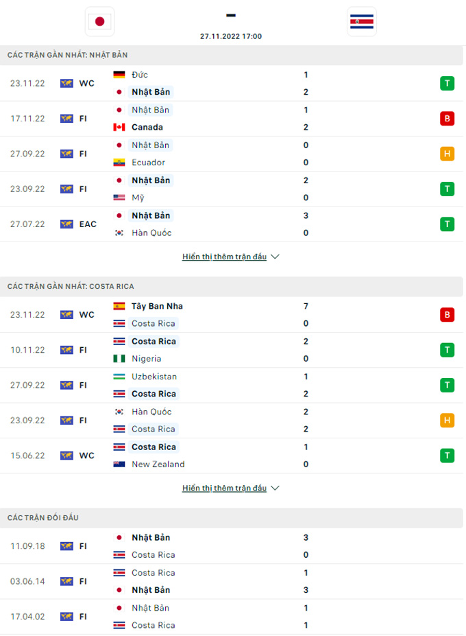- Cả trận: Nhật Bản 2 – 1 Costa Rica