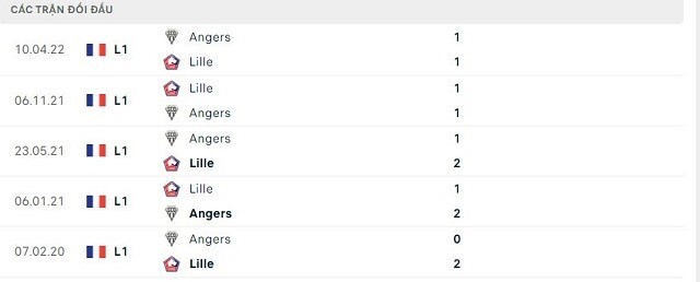 Lịch sử đối đầu của Lille vs Angers