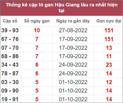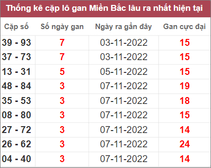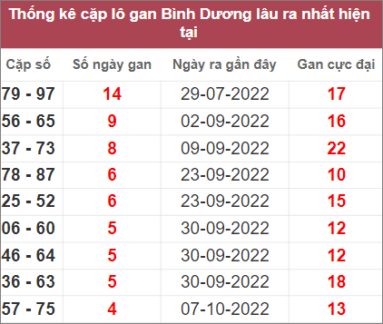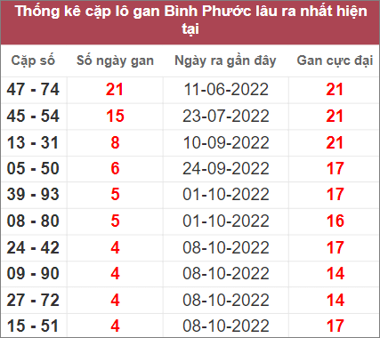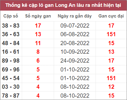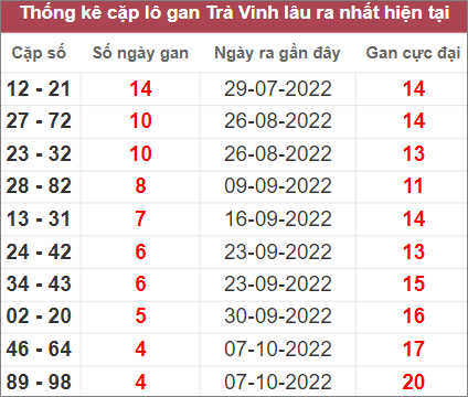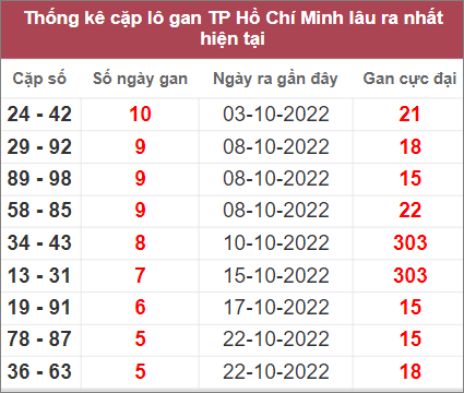 Bảng thống kê những cặp số lâu không xuất hiện nhất