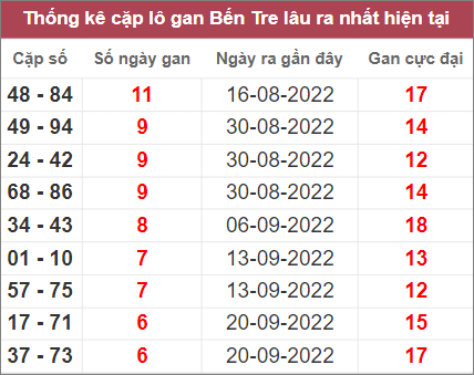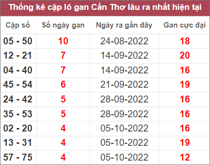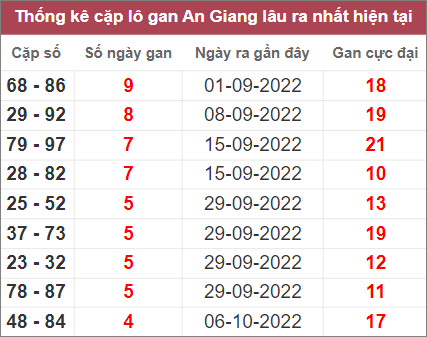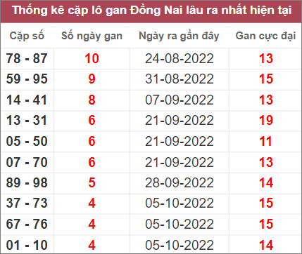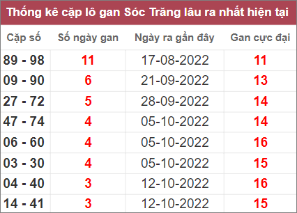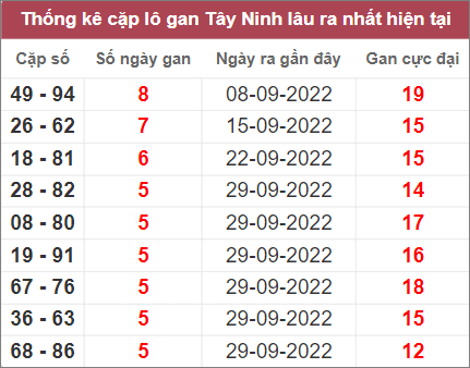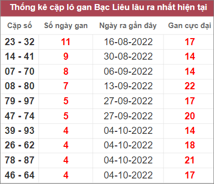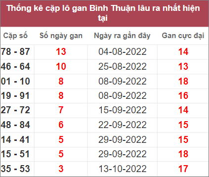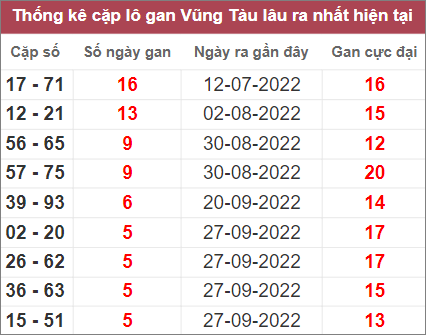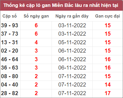 Bảng thống kê những cặp số lâu không xuất hiện nhất