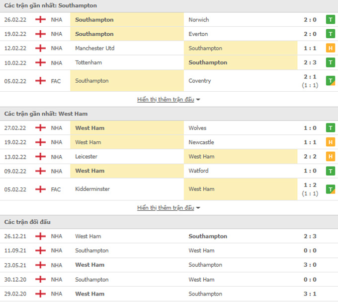 4 lần gần nhất tiếp đón The Saints, West Ham đều ghi từ 2 bàn trở lên. Nhưng các học trò của ông Pellegrini cũng phải nhận từ 2 bàn thua trở lên ở cả 3 vòng vừa qua tại Premier League.