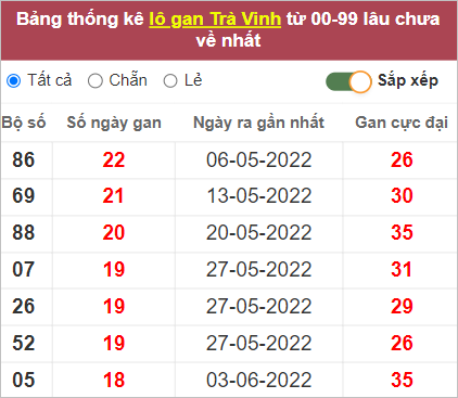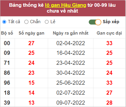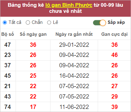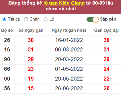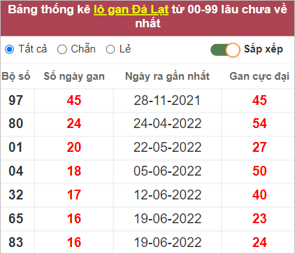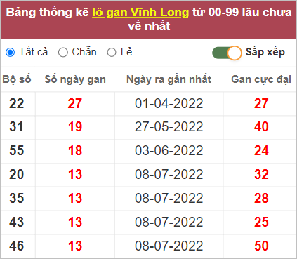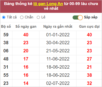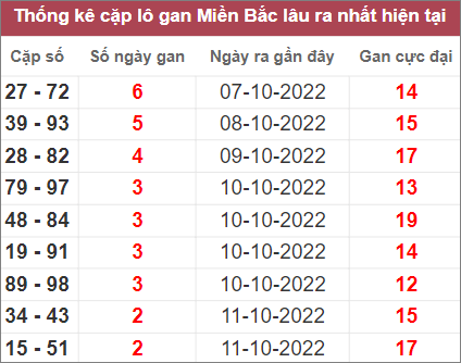 Bảng thống kê những cặp số lâu không xuất hiện nhất
