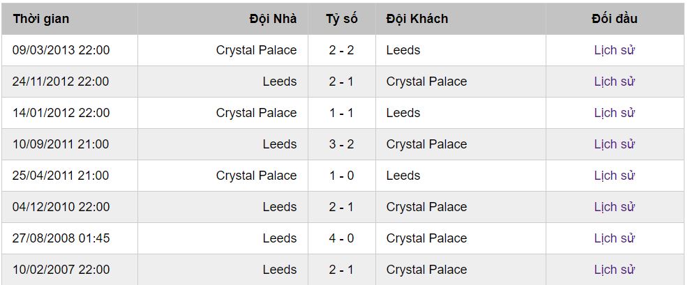 Khi còn thi đấu tại Premier League, Leeds United là một trong những đối thủ thuộc dạng ‘khó chịu’ bậc nhất đối với Crystal Palace. Bằng chứng: Leeds thắng 3/6 lần so tài trước đây cùng Crystal Palace thuộc khuôn khổ Ngoại hạng Anh. 3/4 lần chạm trán gần nhất ở giải đấu này kết thúc với niềm vui trọn vẹn dành cho Leeds.