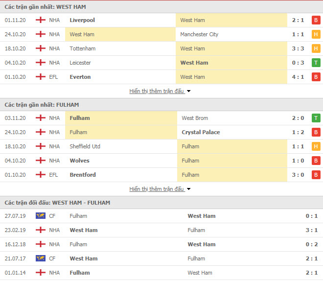 Ngoài ra, lịch sử đối đầu cũng chỉ ra West Ham là cái tên sáng giá ở trận đấu này. Theo đó, đội quân của HLV David Moyes thắng 7 và chỉ để thua 2 lần trong số 9 trận derby trước Fulham.