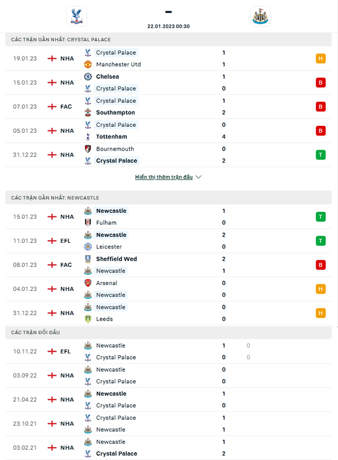 Palace chỉ thắng được 1/5 trận gần nhất tại Premier League. Trong khi đó, Newcastle bất bại 5 trận gần nhất tại Premier League (thắng 3). Ngoài ra, Newcastle bất bại 4 trận gần nhất đối đầu với Palace (thắng 2). 3 điểm khó thoát khỏi tay của thầy trò Eddie Howe.