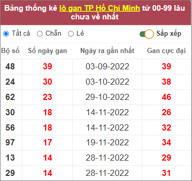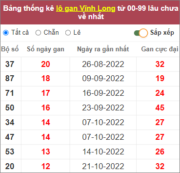 Bảng thống kê những cặp số lâu không xuất hiện nhất