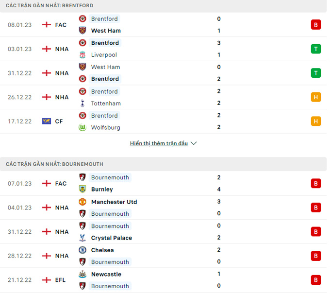 • Cả trận: Brentford 1 – 0 AFC Bournemouth