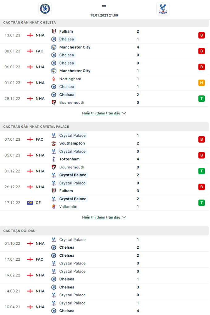 Mọi thống kê về thành tích đối đầu lúc này đều đang chống lại các cầu thủ Crystal Palace, khi họ được xem là miếng “mồi ngon” của Chelsea. Tuy nhiên, đó đã là chuyện của quá khứ và ở thời điểm hiện tại đội bóng của HLV Patrick Viera hoàn toàn có thể nghĩ đến việc giành điểm trước một Chelsea đang lâm vào một cuộc khủng hoảng trầm trọng từ nhân sự cho tới phong độ cũng như tinh thần thi đấu.