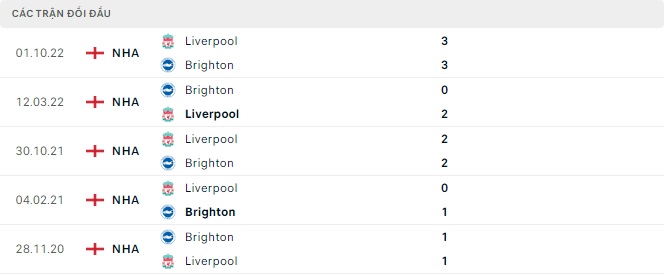Lịch sử đối đầu của Brighton & Hove Albion vs Liverpool