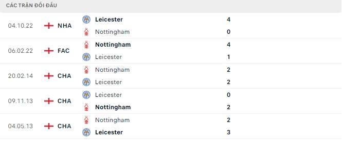 Lịch sử đối đầu của Nottingham Forest vs Leicester City