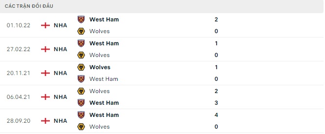 Lịch sử đối đầu của Wolverhampton vs West Ham United