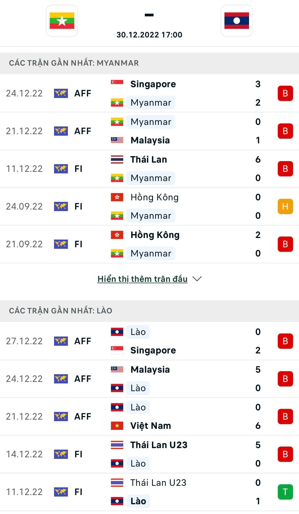 Myanmar và Lào là hai đội bóng duy nhất ở bảng B vẫn chưa có điểm số nào kể từ đầu giải. Myanmar để thua 2 trận đầu tiên trước Malaysia và Singapore. Trong khi đó, Lào nhận 3 thất bại liên tiếp trước Việt Nam, Malaysia và mới nhất là Singapore. Với việc tiếp tục trắng tay trước Singapore trên sân nhà, Lào chính là đội bóng đầu tiên ở bảng B sớm phải chia tay AFF Cup 2022.