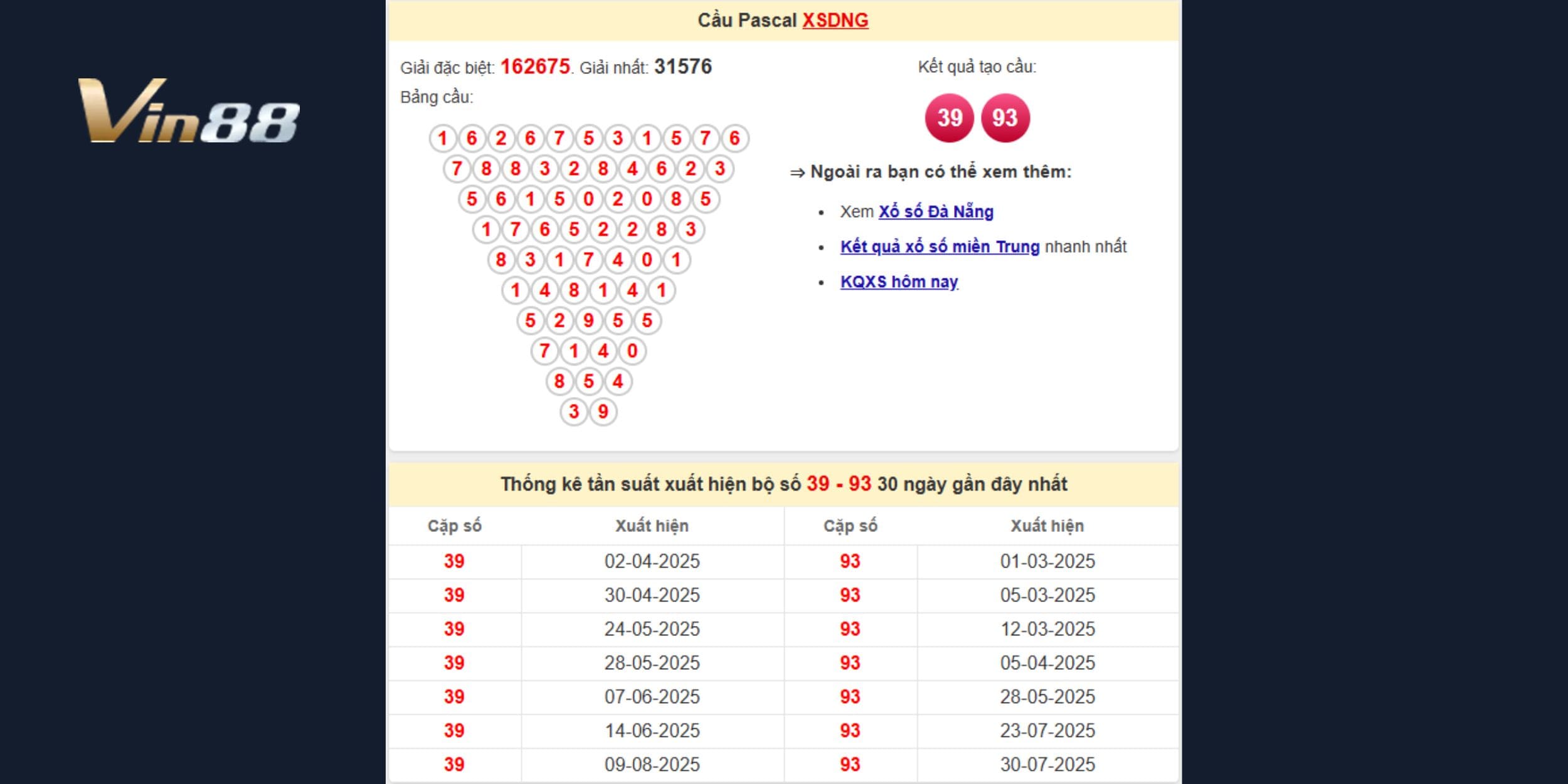 Từ dữ liệu giải Đặc Biệt 162675 và giải Nhất 31576 của kỳ 06/09, cầu Pascal hình thành cặp đôi 39 – 93. Khi đối chiếu với bảng thống kê, cặp số này cho thấy sự ổn định và có chu kỳ rơi khá đều, tạo ra nhiều kỳ vọng trong kỳ quay sắp tới. Các phân tích chi tiết từ VIN88 đã cho thấy rằng.