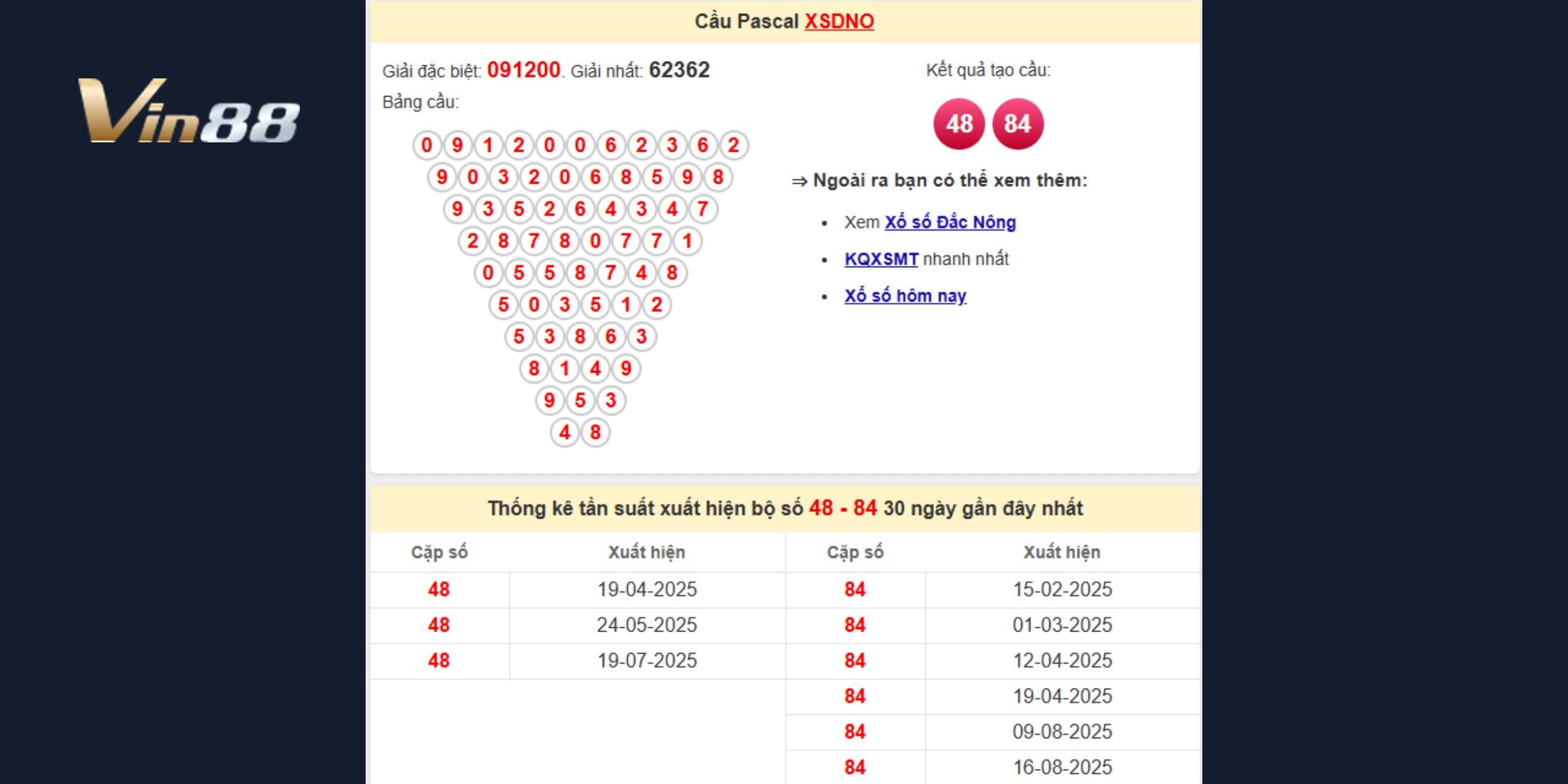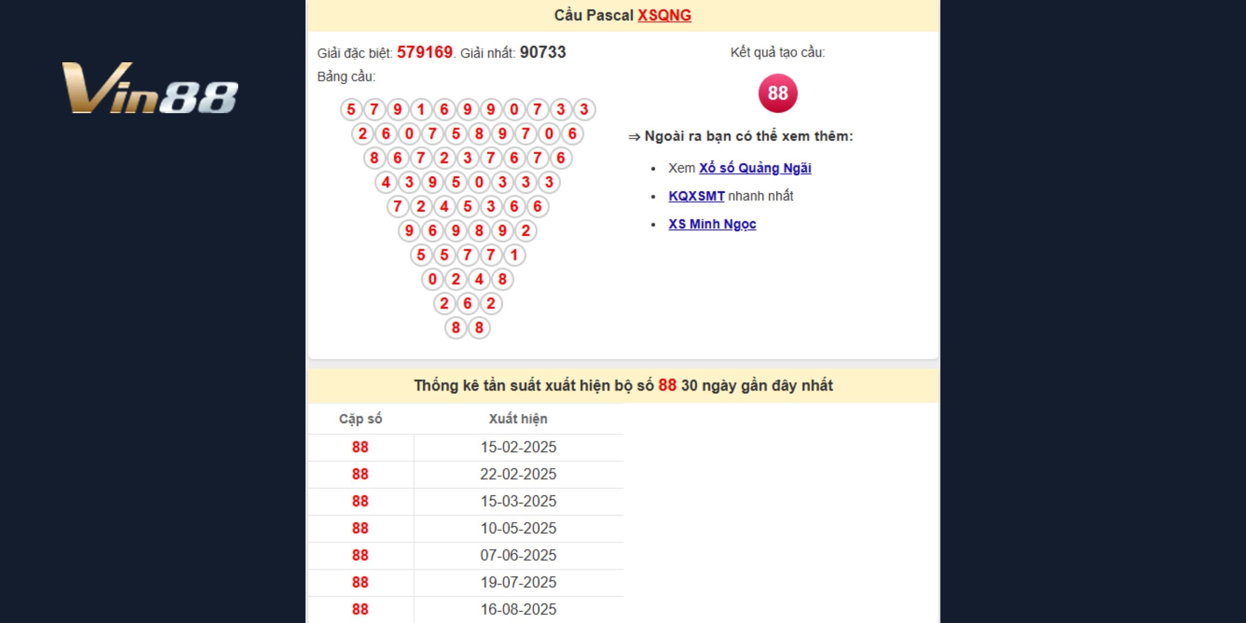 • Với đài Quảng Ngãi, từ giải Đặc Biệt 579169 và giải Nhất 90733, cầu Pascal hình thành số 88, một con số kép mạnh mẽ với độ bền cầu cao. Trong 30 ngày qua, 88 đã về 7 lần gần nhất vào ngày 16/08 và hiện đang gan 3 ngày, thấp hơn nhiều so với ngưỡng cực đại 33. Ngoài 88, các con số đi kèm như 33 và 99 thường tạo cầu tam giác giúp gia tăng độ chắc chắn.