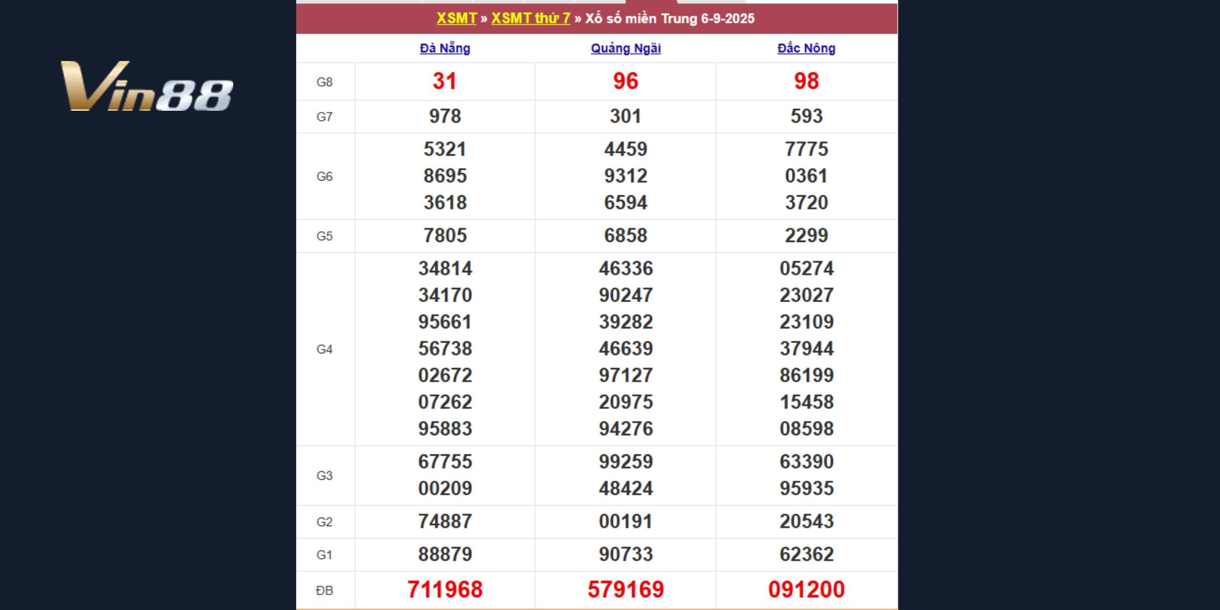 Dự đoán xổ số miền Trung ngày 13-09-2025 tại nhà cái VIN88 mang đến cho người chơi cái nhìn toàn diện từ cầu Pascal, thống kê tần suất đến lô gan chi tiết. Bài phân tích bao gồm các đài Đà Nẵng, Quảng Ngãi,  Đắk Nông giúp bạn nắm bắt xu hướng đầu – đuôi, dàn loto VIP cũng như bạch thủ lô sáng giá. Đây sẽ là nguồn tham khảo hữu ích để tối ưu lựa chọn xu hướng cho kỳ quay sắp tới.