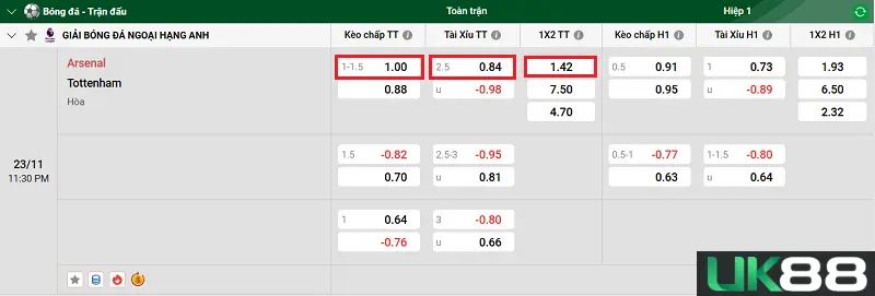 Kèo chấp của nhà cái UK88 đã đưa ra là chủ nhà Arsenal chấp kèo đội khách Tottenham từ -1.0 đến -1.50 bàn. Với kèo chấp khá sâu này thì chủ nhà Arsenal sẽ cần phải giành lấy được chiến thắng với cách biệt 2 bàn trước Tottenham thì cửa trên sẽ thắng. Đây được xem là không quá khó khăn đối với Pháo thủ Arsenal bởi phong độ đang lên cao và có thành tích đối đầu áp đảo. Bên cạnh đó, sân nhà Emirates là nơi dễ đi khó về đối với mọi đội bóng tại Ngoại hạng Anh mùa giải năm nay, đặc biệt là các đội bóng cùng thành phố. Do đó, người chơi nên lựa chọn cửa chủ nhà Arsenal chấp kèo là khá an toàn.
