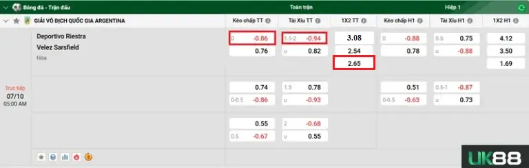 Kèo nhà cái đang để tỷ lệ chấp kèo ở mức hòa -0.0 đến -0.5 bàn ở trận đấu này. Lý do bởi hai đội bóng đang được đánh giá cao khi dẫn đầu trên bảng xếp hạng của giải đấu quốc nội. Tuy nhiên có sự ưu ái cho đội khách Velez Sarsfield khi được đánh giá cao hơn dù phải thi đấu trên sân khách, bởi kết quả có lợi trên sân nhà của Deportivo Riestra. Tuy nhiên một kết quả hòa sẽ là hợp lý với màn trình diễn của hai đội.