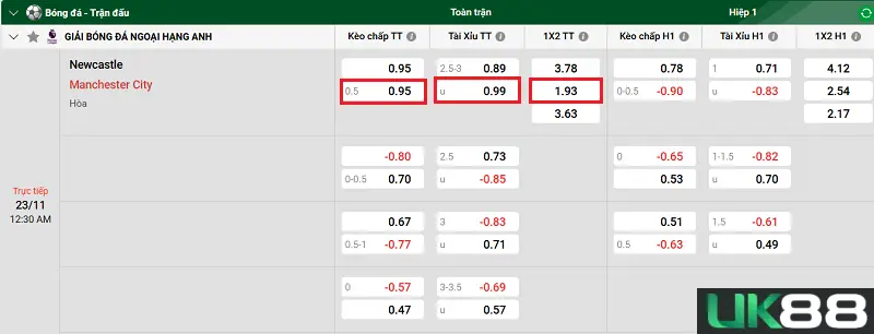Kèo chấp của nhà cái UK88 đã đưa ra là chủ nhà Newcastle chấp kèo đội khách Manchester City từ -0.25 đến -0.75 bàn. Với phong độ thi đấu đã trở lại cộng thêm sự sa sút của đối thủ, Manchester City hoàn toàn đủ năng lực đánh bại được Newcastle. Mặc dù phải thi đấu xa nhà nhưng Manchester City không hề quá bận tâm bởi sự áp đảo của mình về mọi mặt trước Newcastle. Bên cạnh đó, có đến 3 trên 4 lần đối đầu gần nhất Manchester City đều có được thắng lợi trước Newcastle. Do đó, người chơi có thể tin tưởng và đặt vào cửa Manchester City chấp kèo ở trận đấu này.