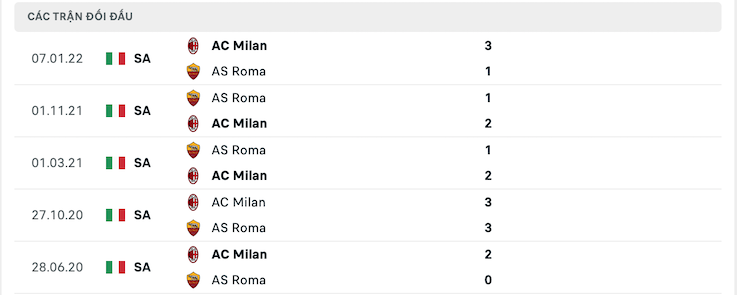 Thành tích đối đầu giữa AC Milan và AS Roma trong 5 trận gần nhất đang nghiêng hoàn toàn về phía đội chủ nhà, câu lạc bộ này giành được 4 chiến thắng còn AS Roma chỉ có 1 trận hòa mà thôi. Trận thắng gần nhất của AS Roma trước AC Milan trên sân nhà của mình là vào 2019, còn khi đá trên sân Stadio Giuseppe Meazza thì trận gần nhất mà đội khách có 3 điểm vào 2017. Bởi vậy, hoàn toàn có thể kỳ vọng AC Milan sẽ làm được điều tương tự ở màn so tài sắp tới.