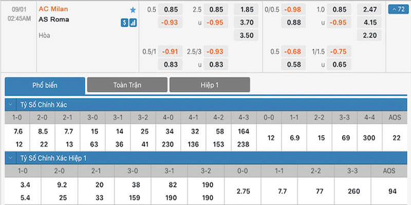 Tỷ lệ kèo giữa AC Milan vs AS Roma