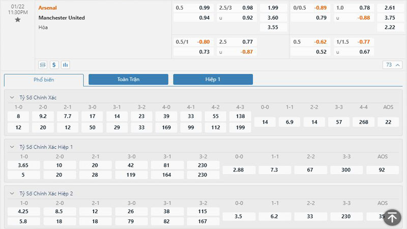 Tỷ lệ kèo giữa Arsenal vs Manchester United