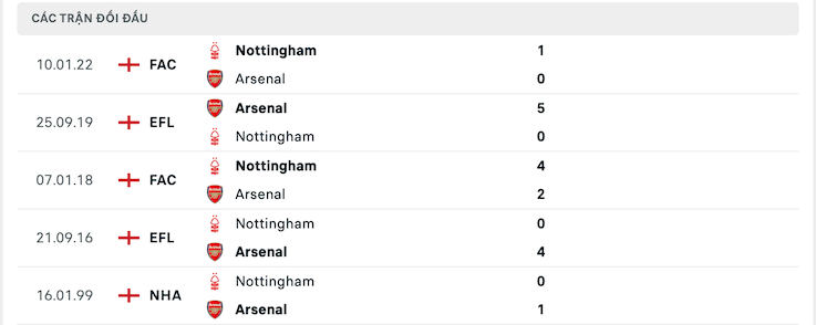 Lịch sử đối đầu của Arsenal vs Nottingham