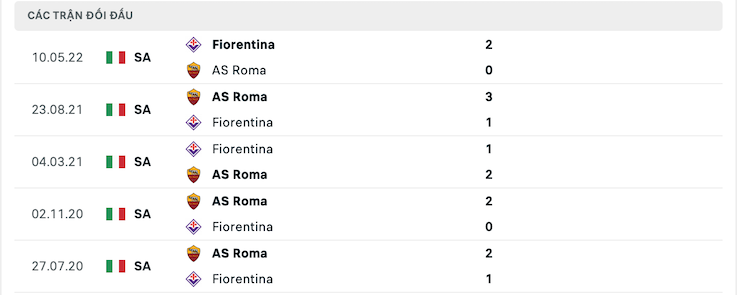 Lịch sử đối đầu của AS Roma vs Fiorentina