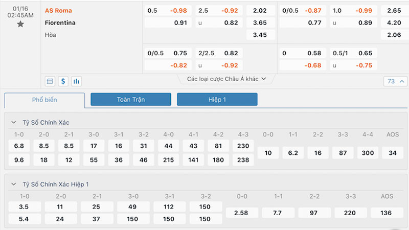 Tỷ lệ kèo giữa AS Roma vs Fiorentina