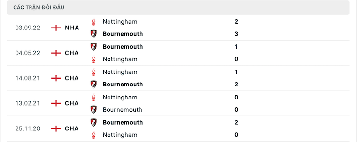 Lịch sử đối đầu của Bournemouth vs Nottingham