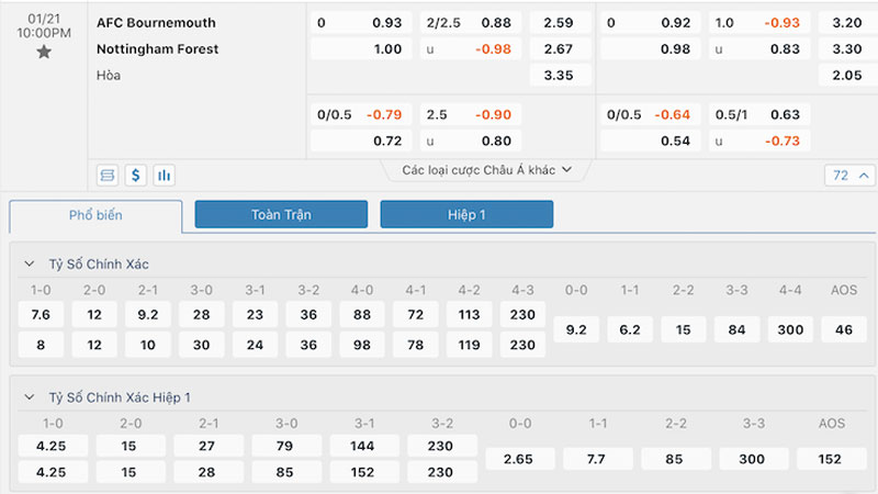 Tỷ lệ kèo giữa Bournemouth vs Nottingham