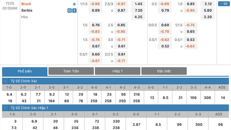 Tỷ lệ kèo giữa Brazil vs Serbia