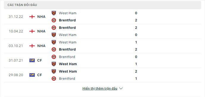 - Hiệp 1: Brentford 0 – 0 West Ham