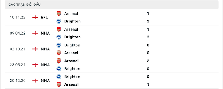 Lịch sử đối đầu của Brighton vs Arsenal