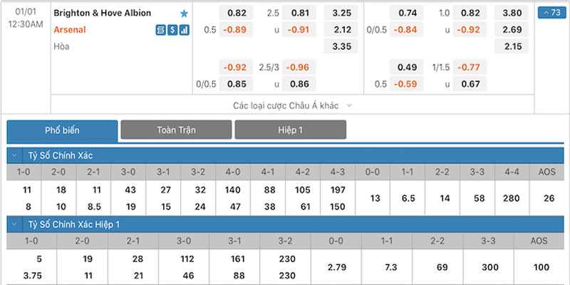 Tỷ lệ kèo giữa Brighton vs Arsenal