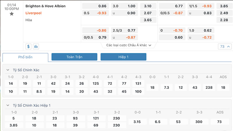 Tỷ lệ kèo giữa Brighton vs Liverpool