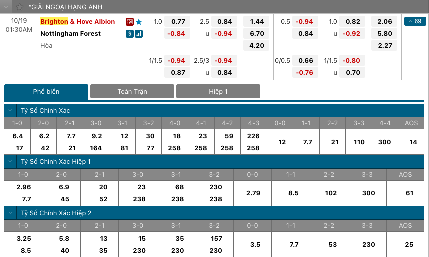 Tỷ lệ kèo giữa Brighton vs Nottingham