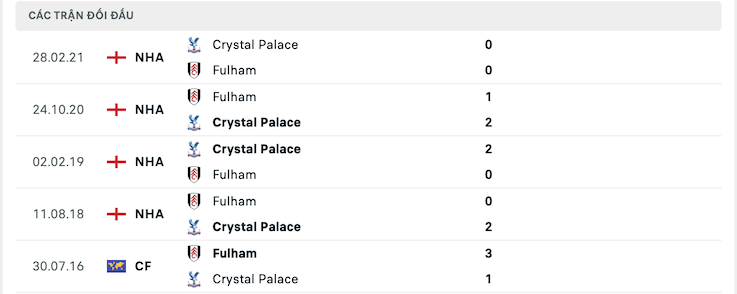 Không chỉ có thực lực nhỉnh hơn mà Crystal Palace cũng hoàn toàn áp đảo Fulham về thành tích đối đầu trong quá khứ. Bằng chứng ở 8 lần so tài trong khuôn khổ Premier League trước đây, The Eagles mang về 4 chiến thắng, 2 trận hòa và chỉ phải nhận 2 trận thua. Với điểm tựa sân nhà cùng sự ủng hộ từ lịch sử, không bất ngờ nếu các học trò HLV Patrick Vieira sẽ mang về trận thắng thứ 6 trong mùa giải.