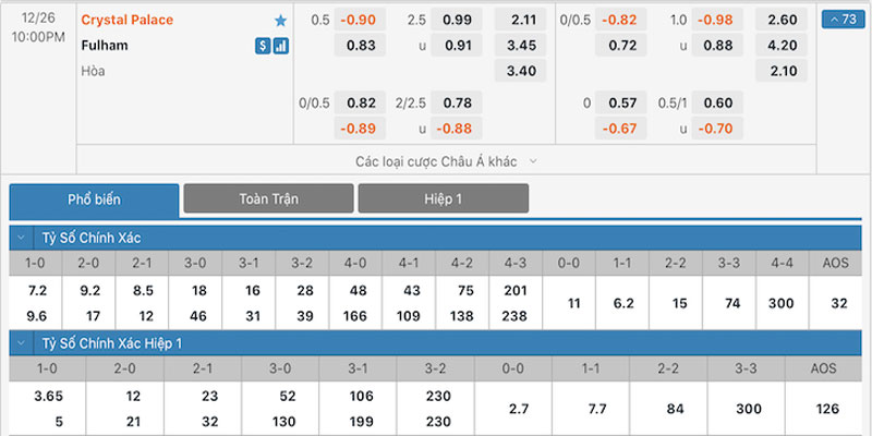 Tỷ lệ kèo giữa Crystal Palace vs Fulham