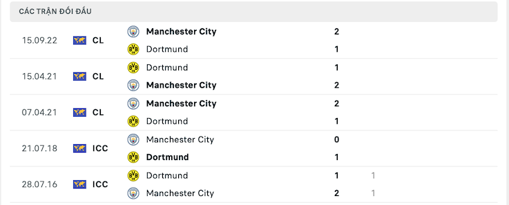Lịch sử đối đầu của Dortmund vs Manchester City