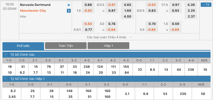 Tỷ lệ kèo giữa Dortmund vs Manchester City