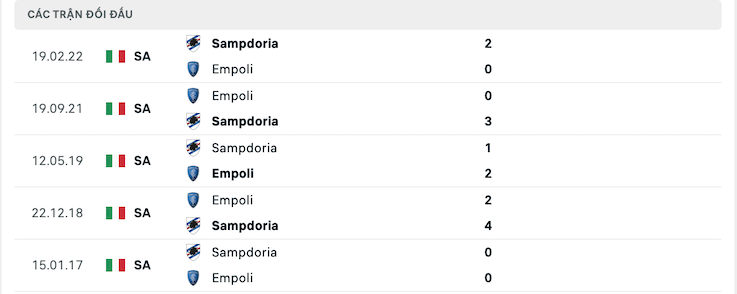 Lịch sử đối đầu của Empoli vs Sampdoria