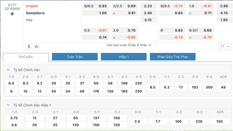 Tỷ lệ kèo giữa Empoli vs Sampdoria