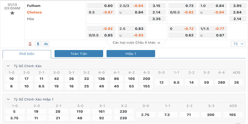 Tỷ lệ kèo giữa Fulham vs Chelsea