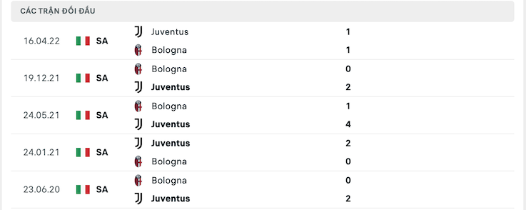 Nhìn vào lịch sử đối đầu trực tiếp giữa hai đội trong 10 lần chạm trán gần nhất, ưu thế nghiêng rõ rệt về phía Juventus. Cụ thể, Juventus giành 9 chiến thắng và chỉ có 1 lần Bologna may mắn cầm hòa thành công. Như vậy, đủ thấy rằng cơ hội để đội khách kiếm điểm trong chuyến hành quân sắp tới là không mấy sáng sủa.