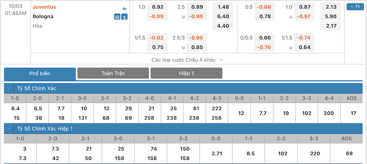 - Hiệp 1: Juventus 0 – 0 Bologna