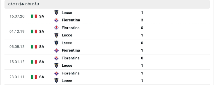 Lịch sử đối đầu của Lecce vs Fiorentina