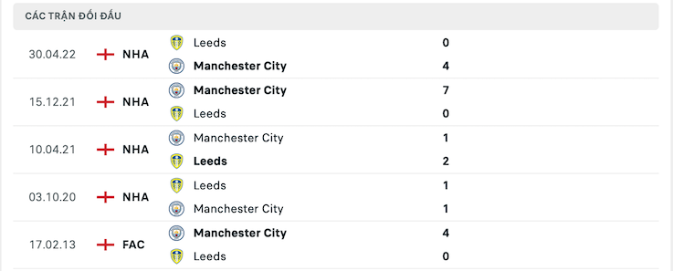 Lịch sử đối đầu của Leeds vs Manchester City