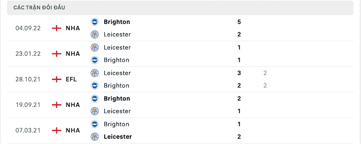 Chạm trán với Leicester đang thể hiện không tốt vào lúc này sẽ là cơ hội tốt để Brighton mang về cho mình 3 điểm trọn vẹn. Rõ ràng là chỉ cần chơi đúng sức thì đoàn quân của HLV Roberto De Zerbi hoàn toàn có thể mang về một thắng lợi dễ dàng. Trong 5 lần 2 đội gặp nhau gần đây nhất thì Brighton đang có ưu thế với 2 chiến thắng 2 trận hoà và 1 trận thua. Phong độ đôi bên hiện tại là hoàn toàn trái ngược, chẳng có lý do gì để Brighton tuột mất chiến thắng.