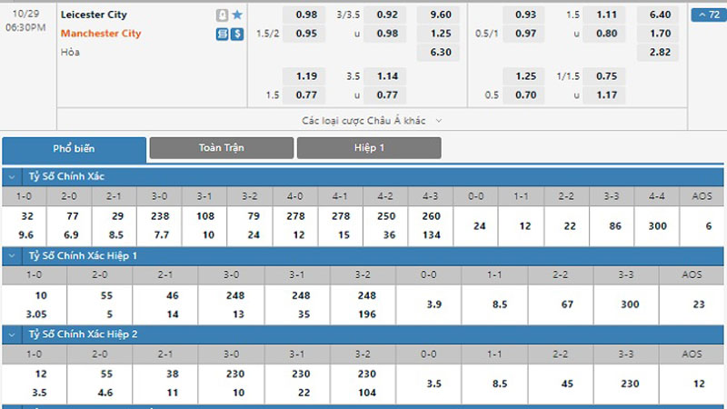 Tỷ lệ kèo giữa Leicester vs Manchester City