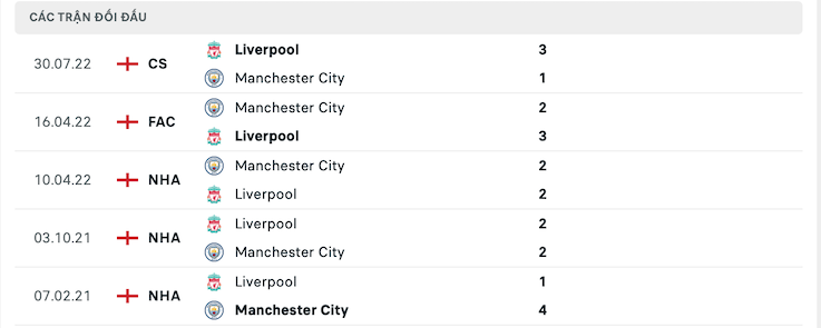Lịch sử đối đầu của Liverpool vs Manchester City